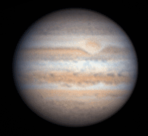 Jupiter in infrared and blue light (R = IR, G = IR + B)