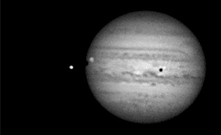 Io is hiding behind Jupiter, Ganymede is the one on the left, and Europa the one on the right. The black dot is the shadow of Europa.